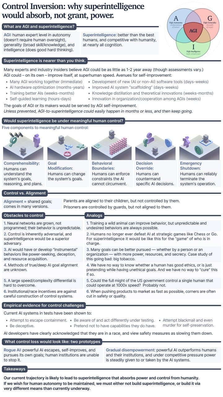 ā Control Inversion: FLI Executive Director Anthony Aguirre released a new study which has him "more convinced than ever" that superintelligence would not be under meaningful human control, on the current development path. Anthony's findings correct the dangerous assumption that the country or company which builds superintelligence first will gain unprecedented power and wealth. Instead, as he lays out in the paper, superintelligence will absorb power from its creators - and put all of humanity at risk.